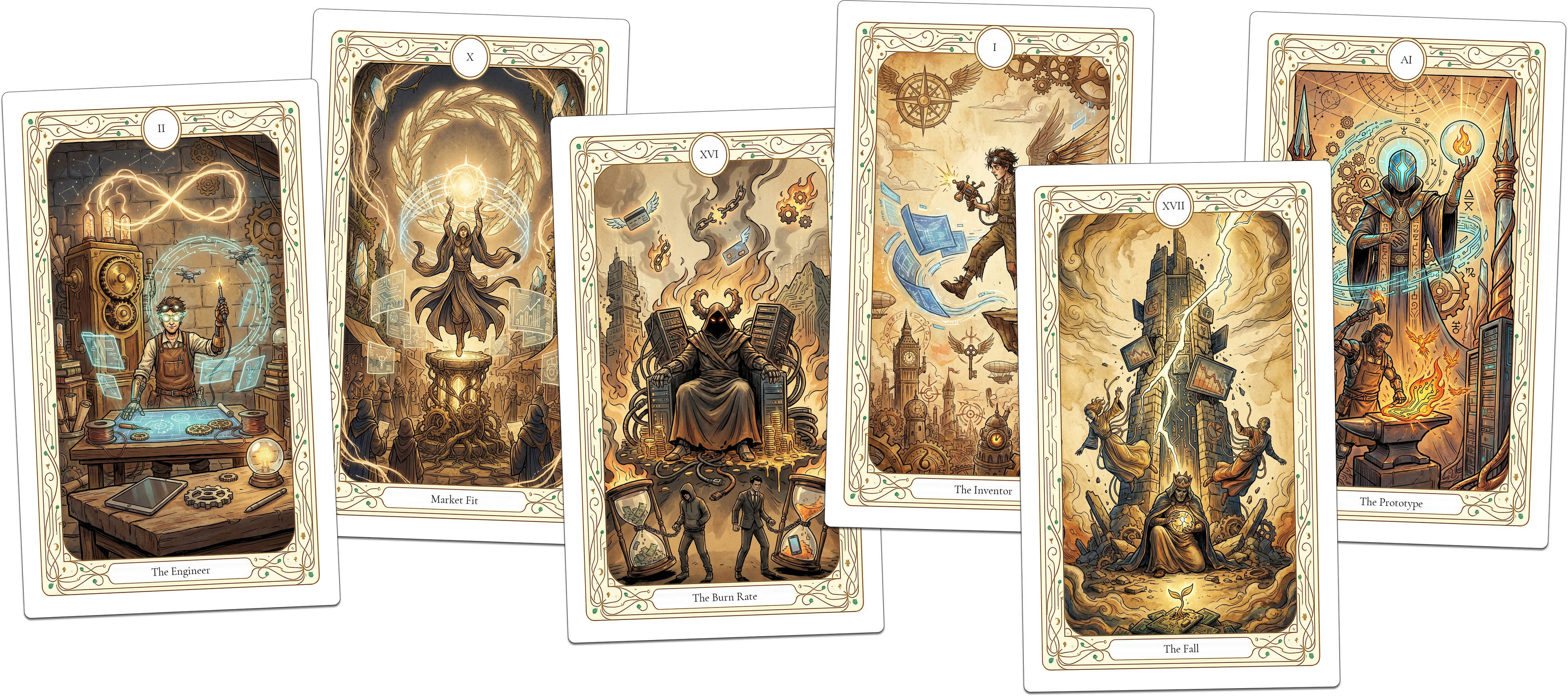 So we took the structure of a classic tarot deck and translated it into startup language. The Major Arcana became founder fate. The suits became forces every company wrestles with. Capital, burn, growth, control.